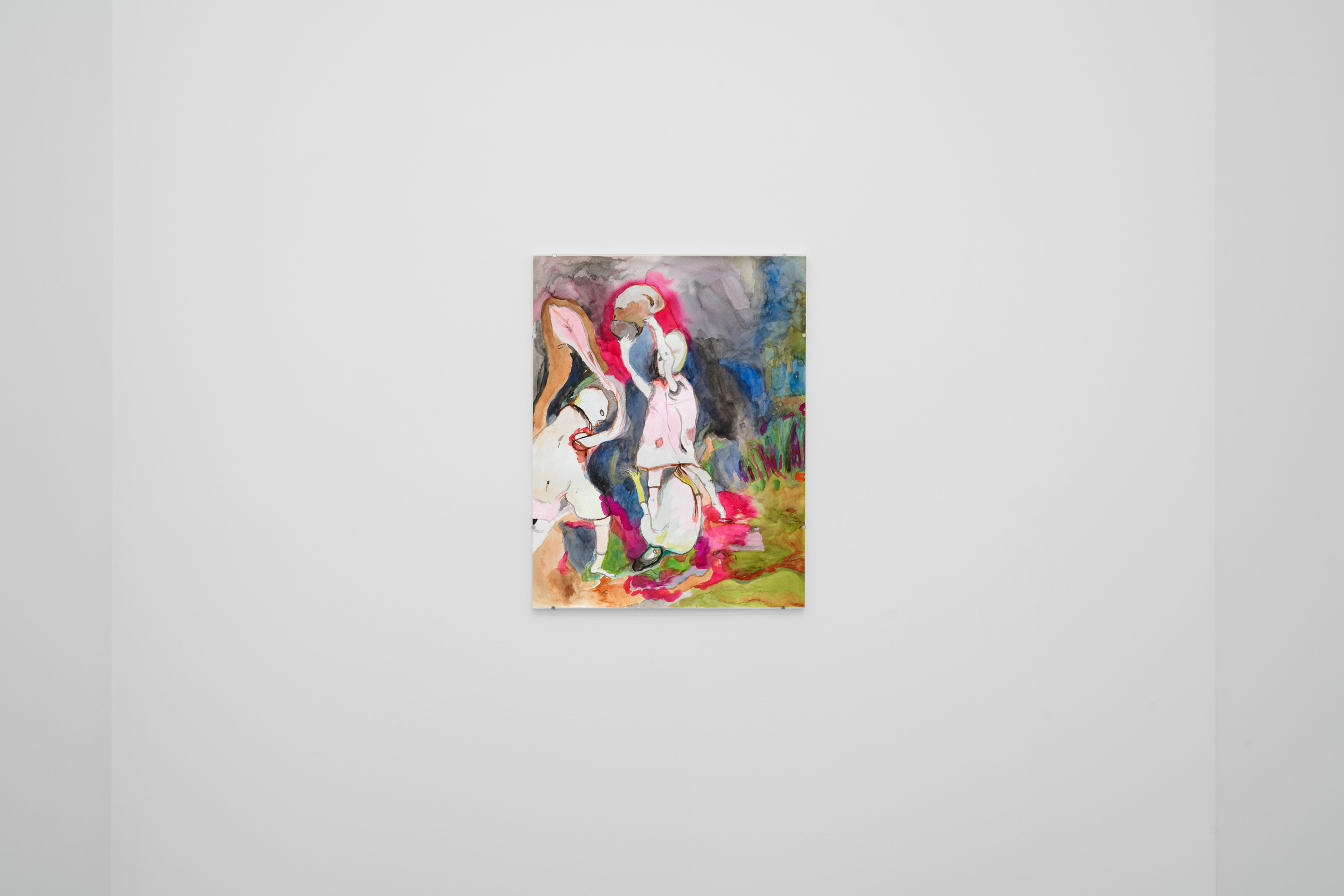Groups of people during leisure time: In her watercolors and textile works, Schulze depicts figures engaged in various activities: picnicking, hunting, bathing – tussling? The scenes seem familiar yet unsettling.
