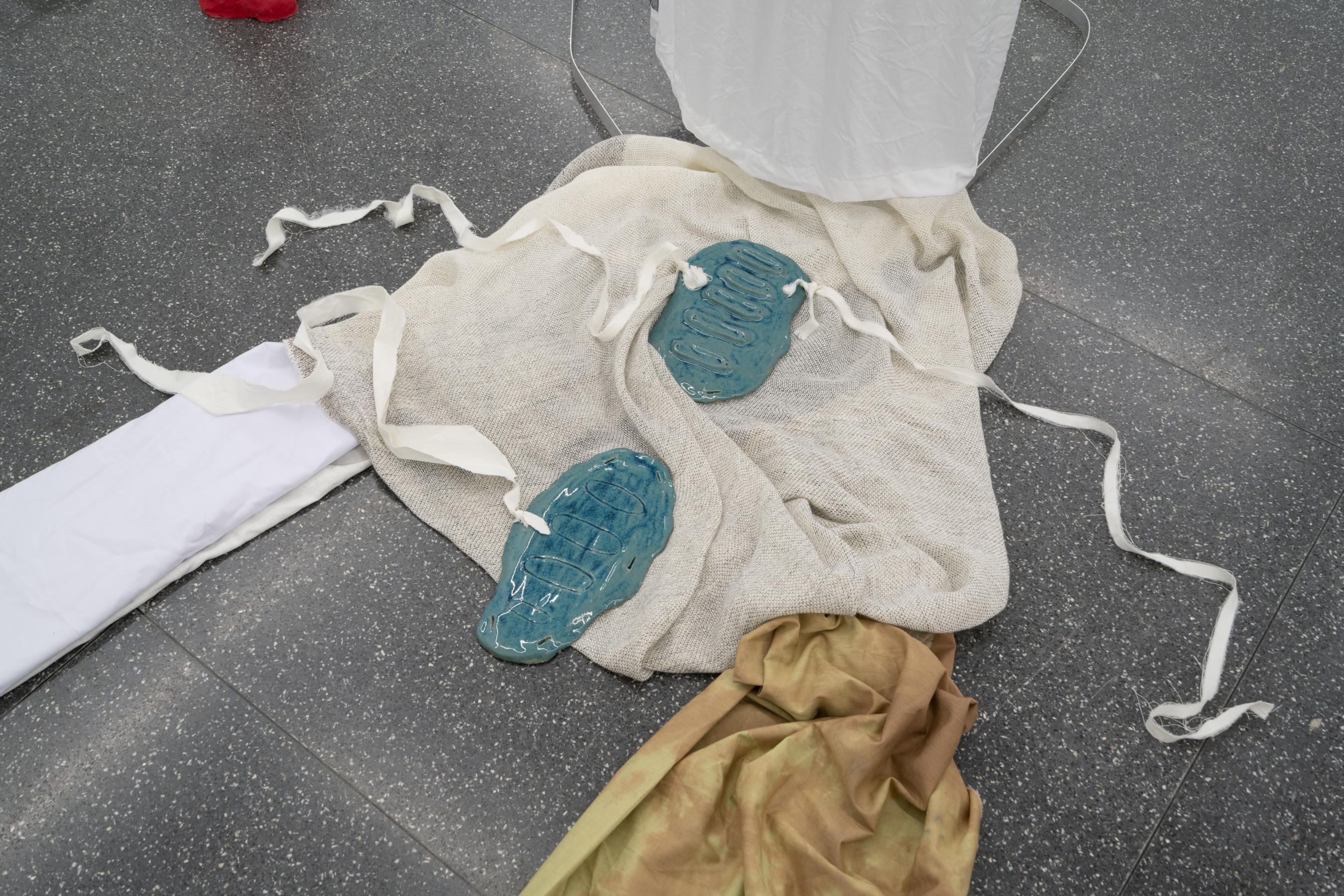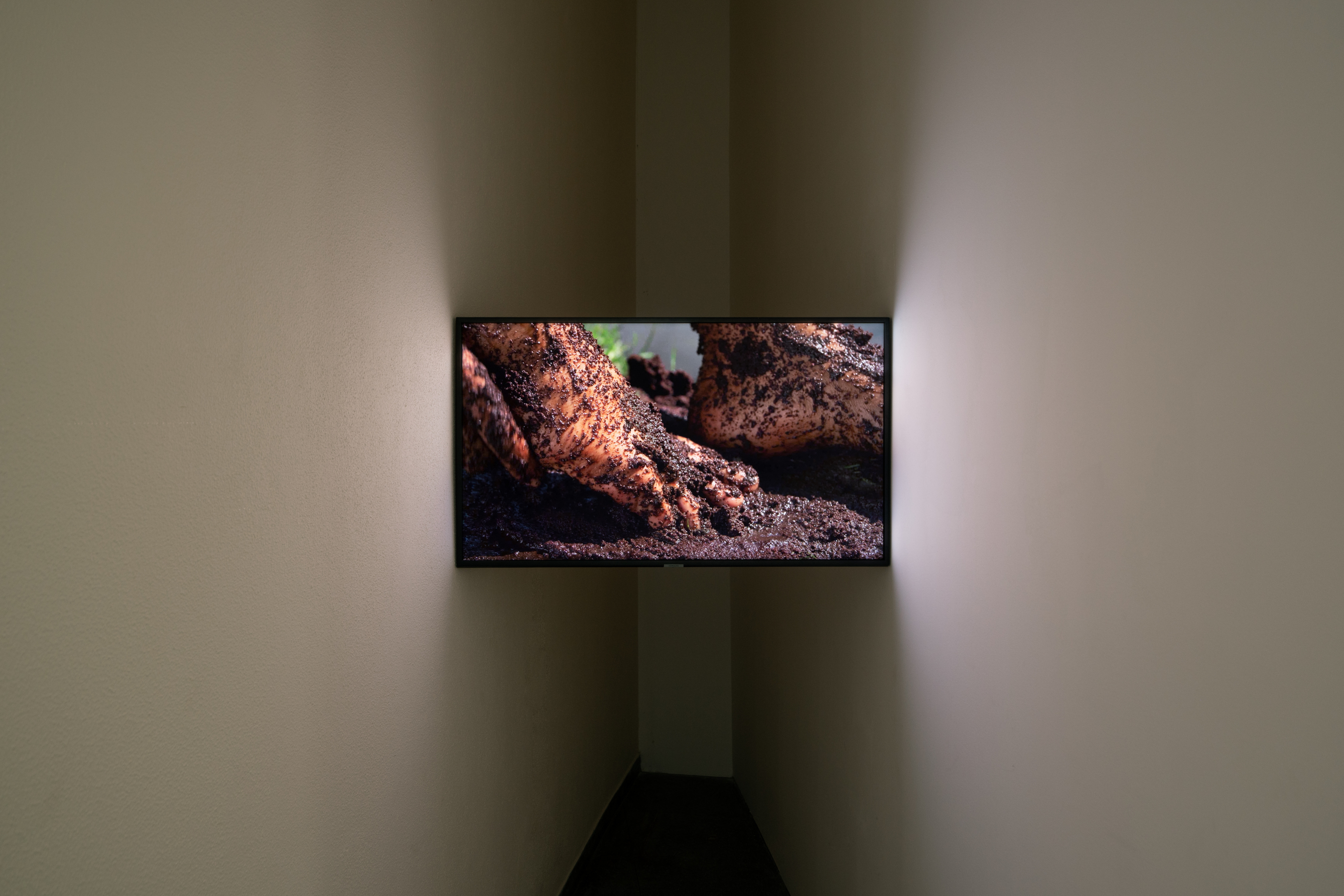With the reversal of roles, the all-queer-female* casts, zoom-ins, and contemporary digital extensions (e.g. the mobile phone at picnic) the artist relocates the sceneries into today and undermines a binary system. The dissolution of dichotomy also becomes visible in the alternating relationships of the figures: it is difficult to tell whether the gestures are affectionate or combative. Their props change from instruments to weapons and vice versa. The image of the snake charmer fits all too well: The snake considers the person and flute (pungi) a threat and responds to it as if it were a predator – a state between hypnosis and attack. Schulze’s polymer sculptures YES I – III gather in the space, devotional sitting and waiting, rather affirmative.
